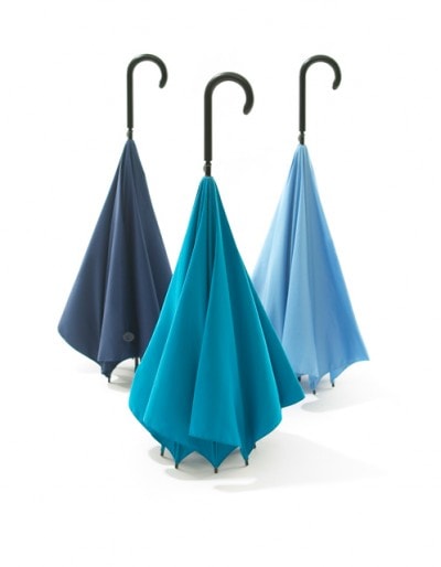 同商品は、デザイナー・梶本博司氏がデザインした、逆さまに開く新しいタイプの傘。閉じた時に濡れた面が内側になるため、洋服や荷物が濡れず、満員電車などの人混みでも周りの人に迷惑をかけることが少なくなるという。