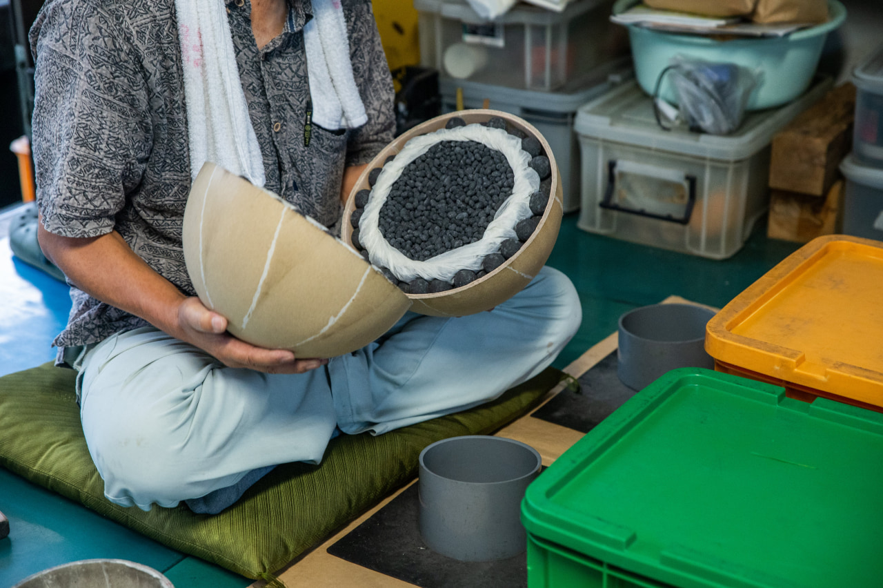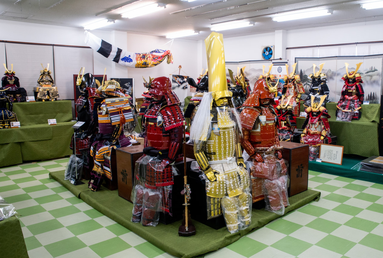剣画堂が製造する、ひおきPR武将隊が実際に着用している等身大鎧です。鹿児島県伝統的工芸品に指定されています。飾った時にきれいに見える初代の仕様から、着用したときに動きやすくなるよう一部仕様変更しているのだそう。