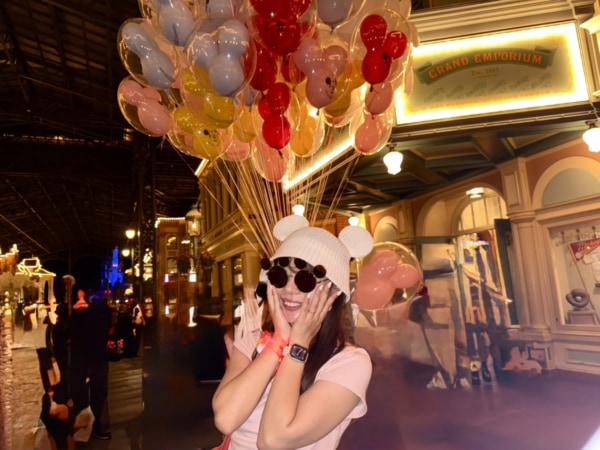 ワールドバザールエリアで販売されているカラフルな風船は、夜の街灯に照らされて、まるで異国のストリートのよう。ディズニーの世界観とマッチして、何気ない1枚もまるで映画のワンシーンみたいに。閉園間際は混雑しやすいので、撮るなら20時前後のタイミングがおすすめです!