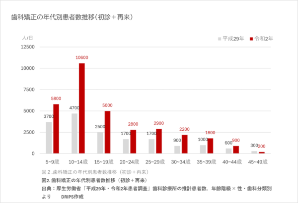 増加数では10代が最も多く、次いで25〜34歳の大人の増加率も高い傾向がみられます。背景にはオーラルの健康意識の高まり、美容目的、経済面での安定が考えられます。