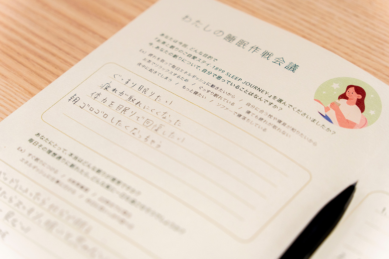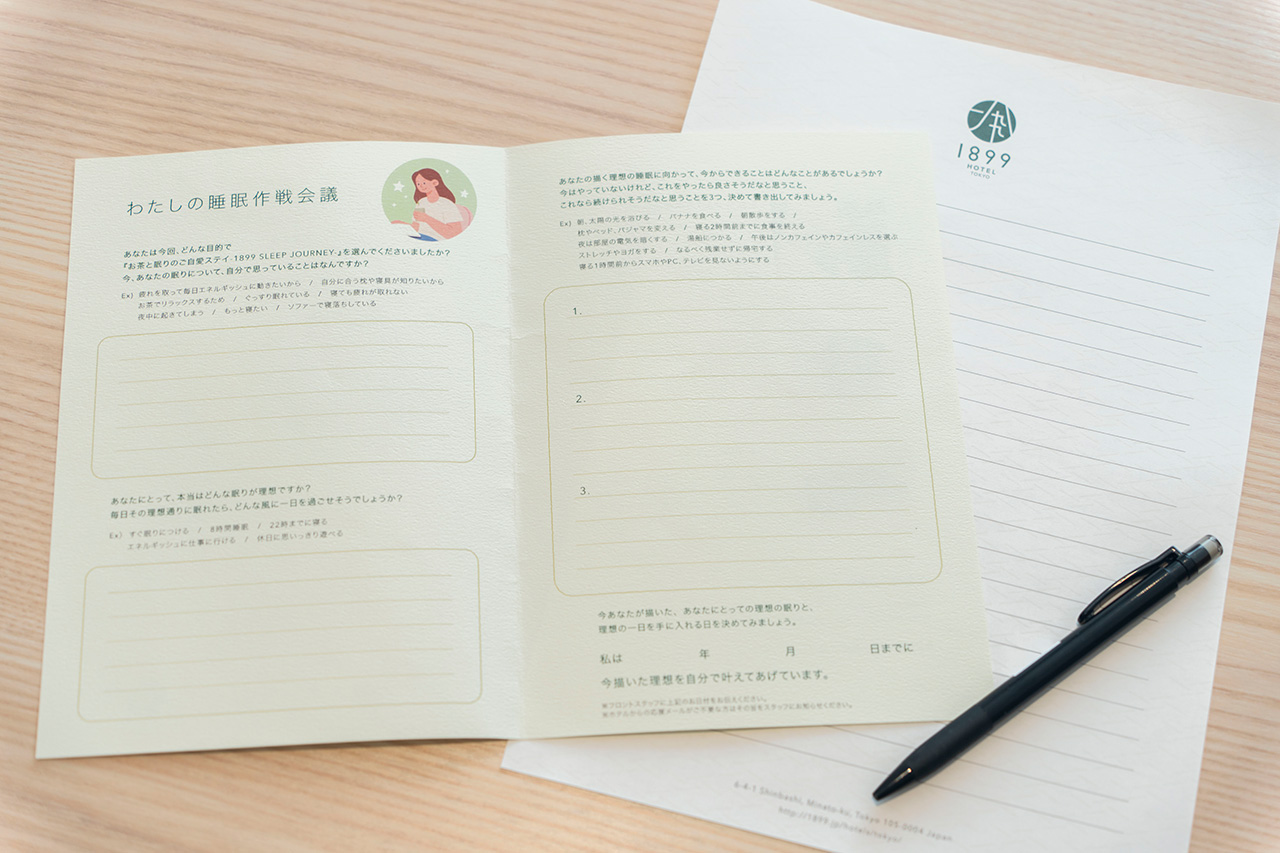 そして「お茶と眠りのご自愛ステイ−1899 SLEEP JOURNEY−」は良質な睡眠を目指すスリープツーリズムを体験できる、期間限定プラン。「睡眠の日」(9月3日)に合わせて、2025年8月1日~11月30日まで販売しています。チェックイン後、渡されたのは1枚の紙。これは睡眠についての目標と改善策を紙に書き出す「ジャーナリング」を行うもので、このプランで予約した人だけに渡されます。