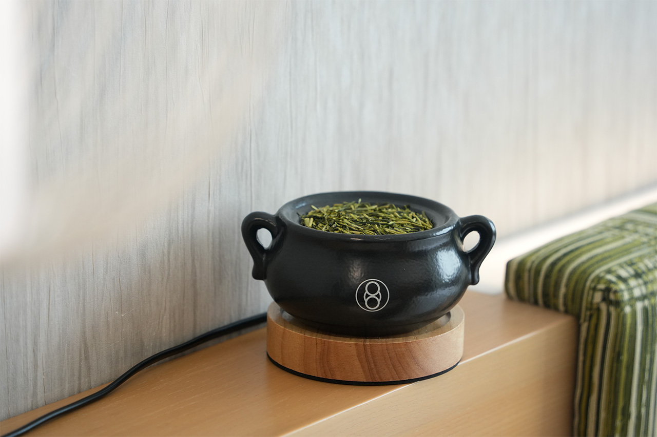 「この発想はなかった」と思ったのが「茶香炉」。お茶の葉に熱を加えて香りを出すもので、客室内がお茶の良い香りで満たされます。アロマを炊くイメージですが、より日本人の心に合うのか、私は心底リラックスできました。おうちでは賞味期限が切れそうなお茶でやるのもありかも!
