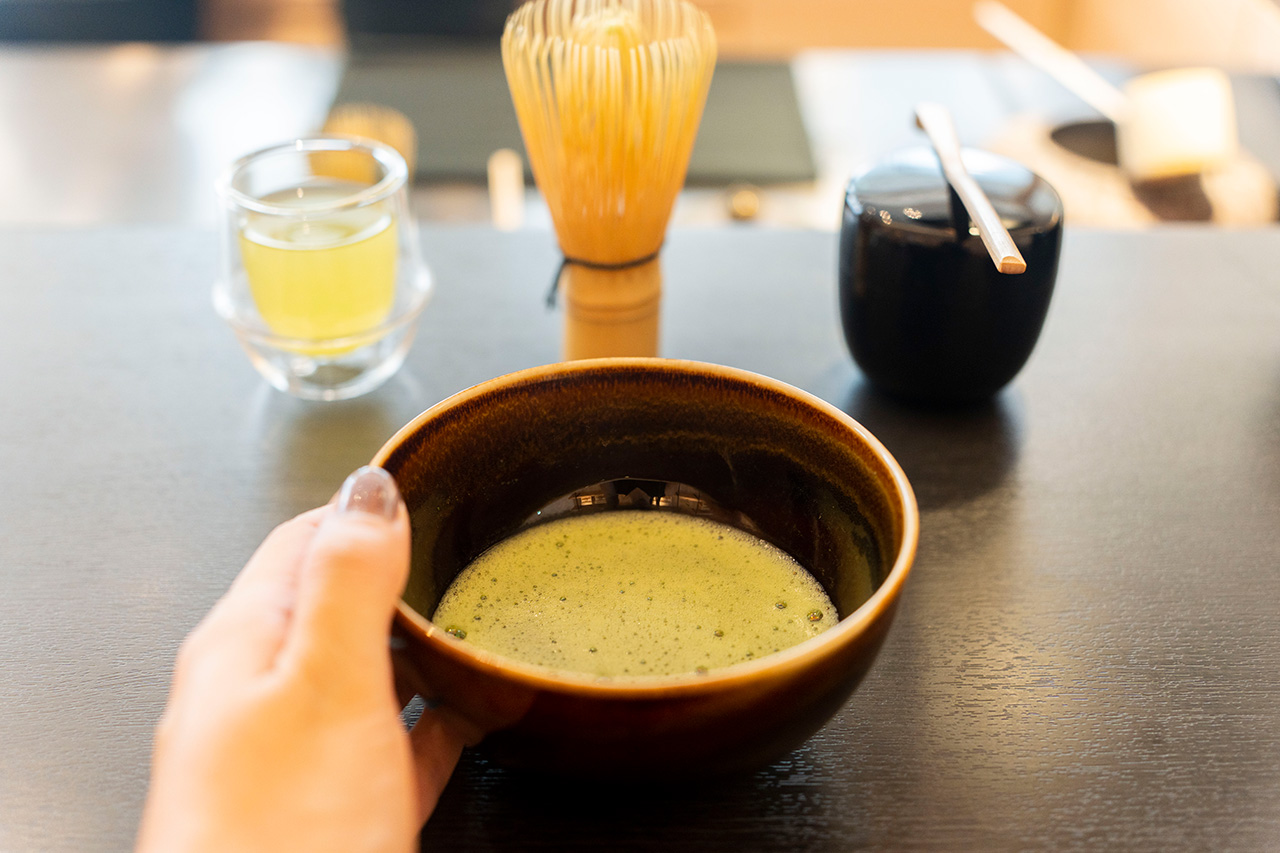 体験できるのは「ご褒美の一服」。点て方を茶バリエから教わり、自分で抹茶を点てることができます。抹茶はカフェインを含んでおり、朝飲むことでシャキッと目覚められるのがポイント。肩肘張らずに気軽に体験できますが、丁寧に器や茶せんを温め、茶巾で器を拭くーーそんな所作をすると身が引き締まり、心も目覚めた感覚になりました。
