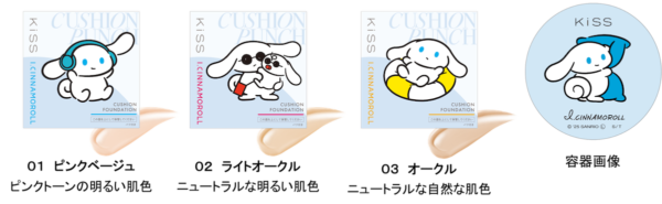 キュートなアイシナモロールが描かれた容器とパフ。さらに、パッケージはカラーごとに異なるデザインを採用。