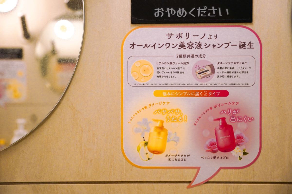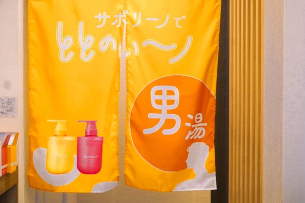 入口では、コラボのコンセプト「サボリーノでととのい~ノ」の文字と新商品シャンプーがプリントされた特注のれんがお出迎え。早速テンションが上がります。