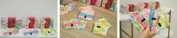 (左から)20.5cm 羽なし/23cm 羽つき/25cm 羽つき 外装パッケージと個包装