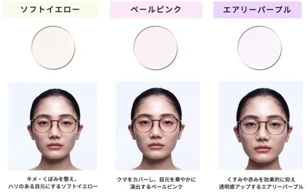 カラーは、肌になじみ健康的な印象を演出する「ソフトイエロー」、くすみを飛ばして目元を華やかに見せる「ペールピンク」、くすみや赤みを効果的に抑え透明感を高める「エアリーパープル」の3色展開。好きなフレーム代金にプラス5,500円で組み合わせが可能です。