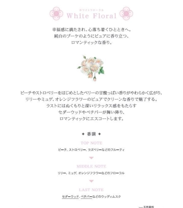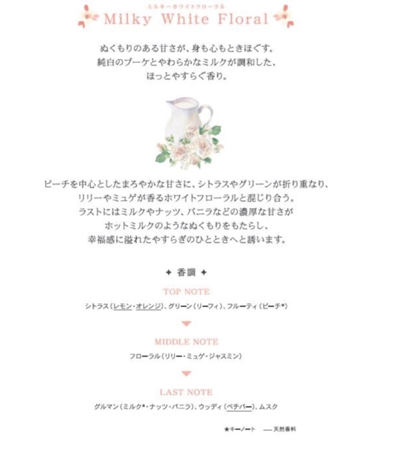 純白のブーケのようなホワイトフローラルがやわらかなミルクと出会ったとき、深い幸福感を呼ぶ特別な香りが広がります。