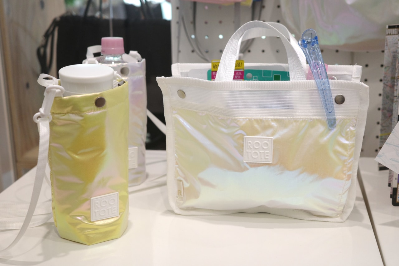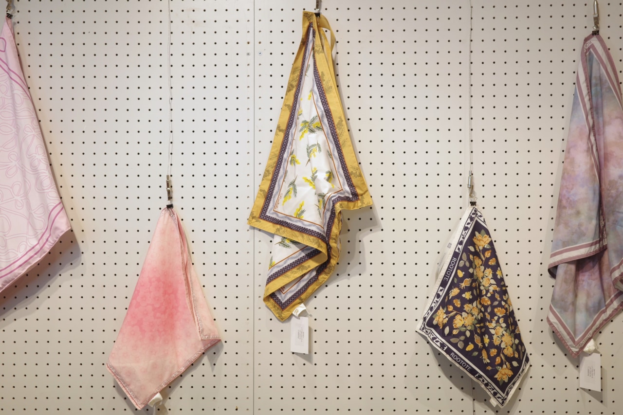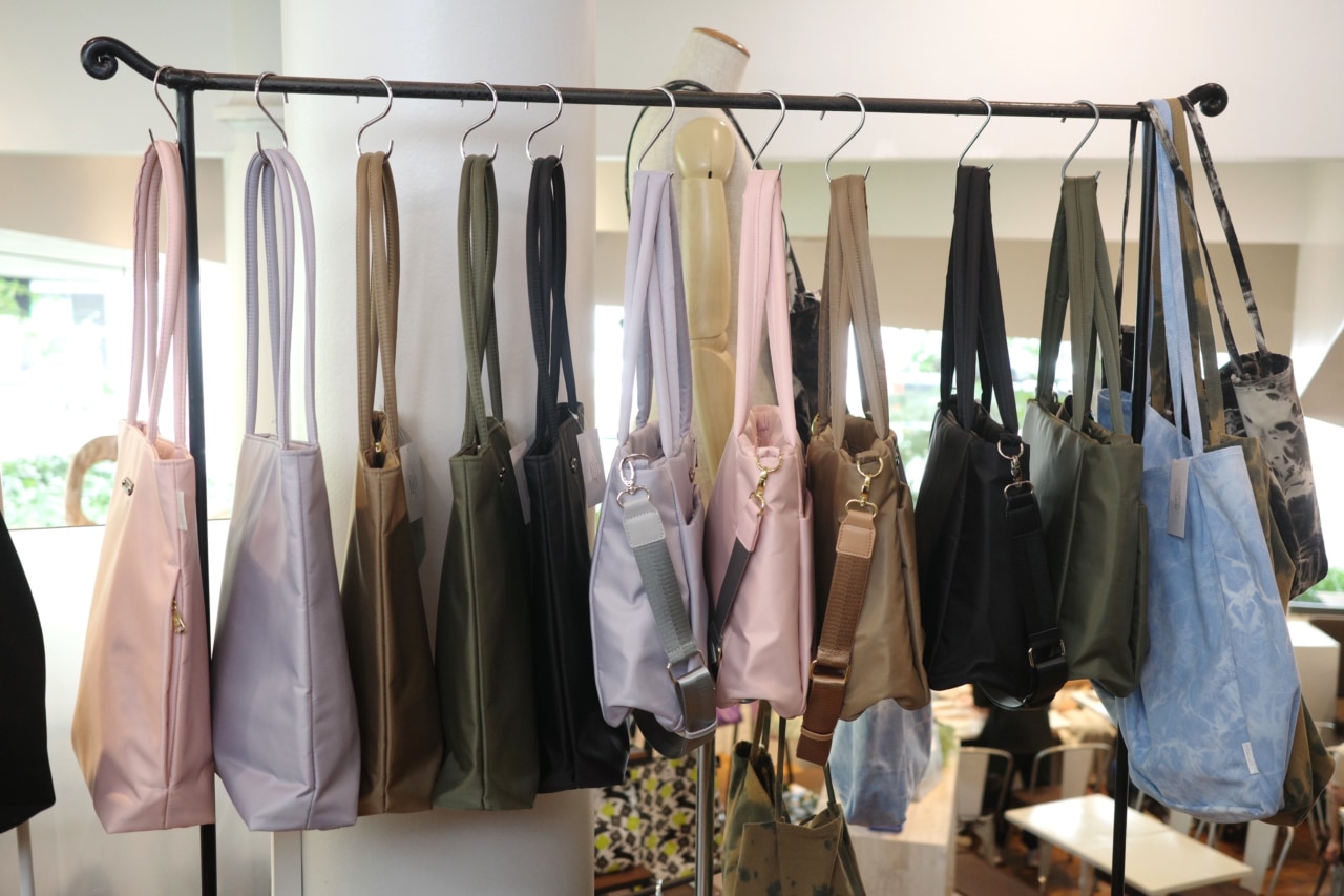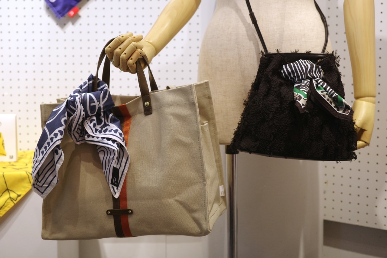展示会で最初に目が引かれたのは「ROOTOTE TABLO」。スカーフのように見えますが、よく見ると持ち手がついています。実はこちらはスカーフのように見えるトートバッグ。収納力たっぷりで、広げればアートのような存在感が魅力です。