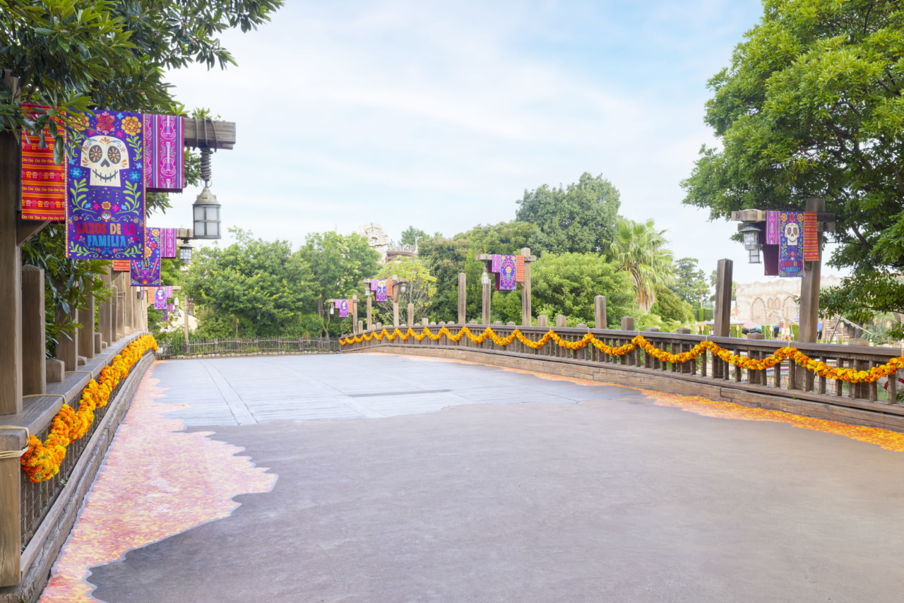 ロストリバーデルタに架かる橋“プエンテ・ブエナ・ヴィスタ”周辺では、カラフルなガイコツや美しいマリーゴールドの花々がずらり。陽気な装飾とあたたかな色合いが、まるでメキシコの街を歩いているかのような気分にさせてくれます。橋を渡りながら写真を撮って雰囲気を楽しむのもおすすめです。
