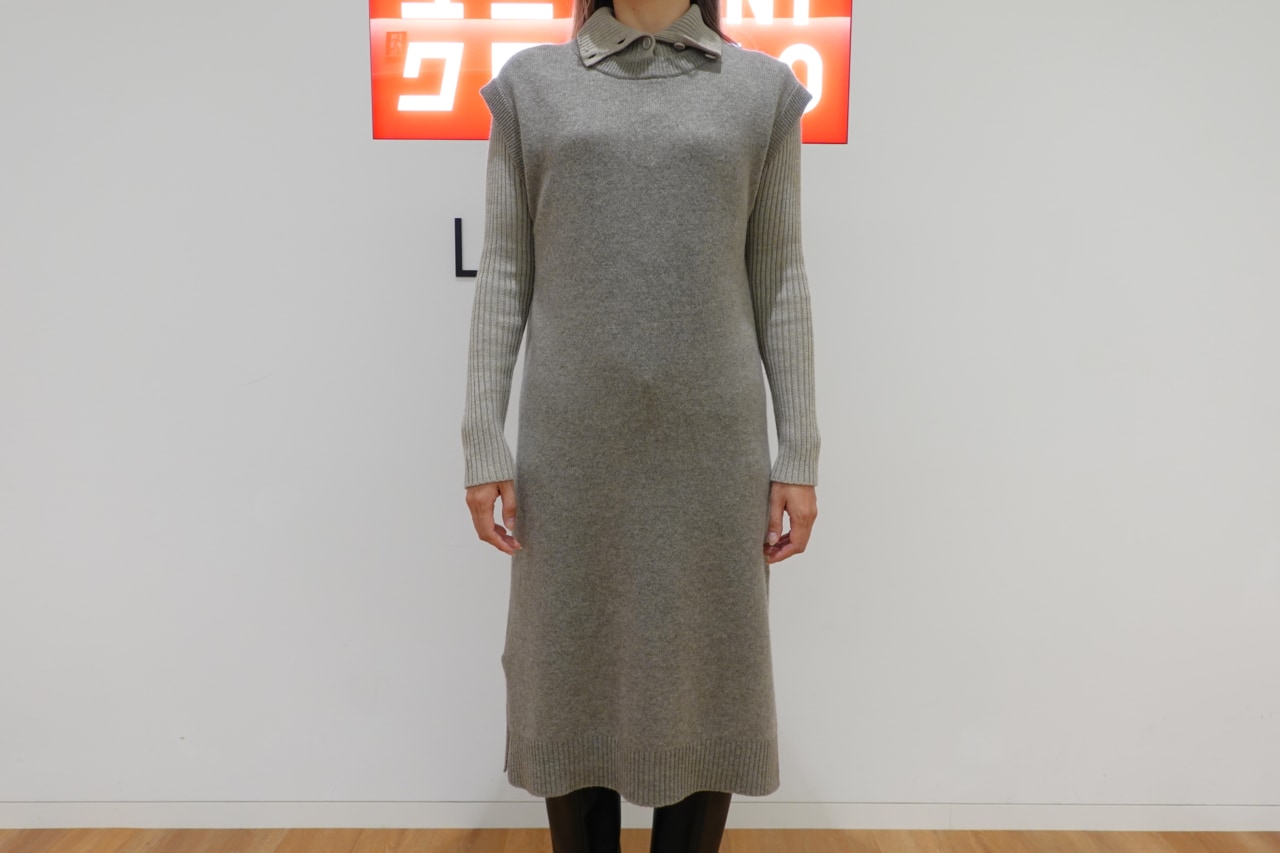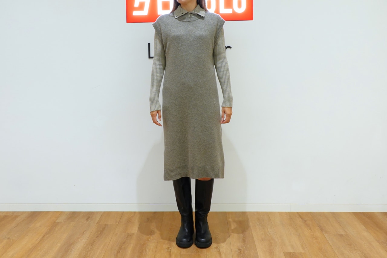 一つ目は、春先まで活躍しそうなノースリーブのニットワンピースを使ったオフィスコーデ。ややゆったりとした「ラムワンピースノースリーブ」は、シャツやカットソー、セーターをレイヤードしたり、中にパンツを合わせたりとさまざまなコーデを楽しめそう!