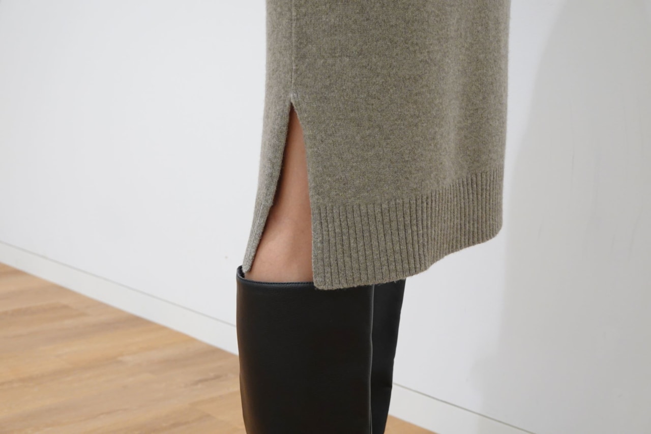 やわらかい上質ウール100%を使用したミドルゲージニットで、ワンピースとして一枚で着ても暖かく、さらにサイドにはスリットが入っているので動きやすさも抜群です。