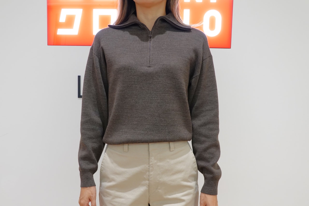 2つ目は、襟元のアレンジ次第で違う表情が楽しめるハーフジップセーターで作るきれいめ×スポーティなコーディネート。「ダブルフェイスハーフジップセーター」は肌あたりが良く、一枚で着ても暖かくて快適!