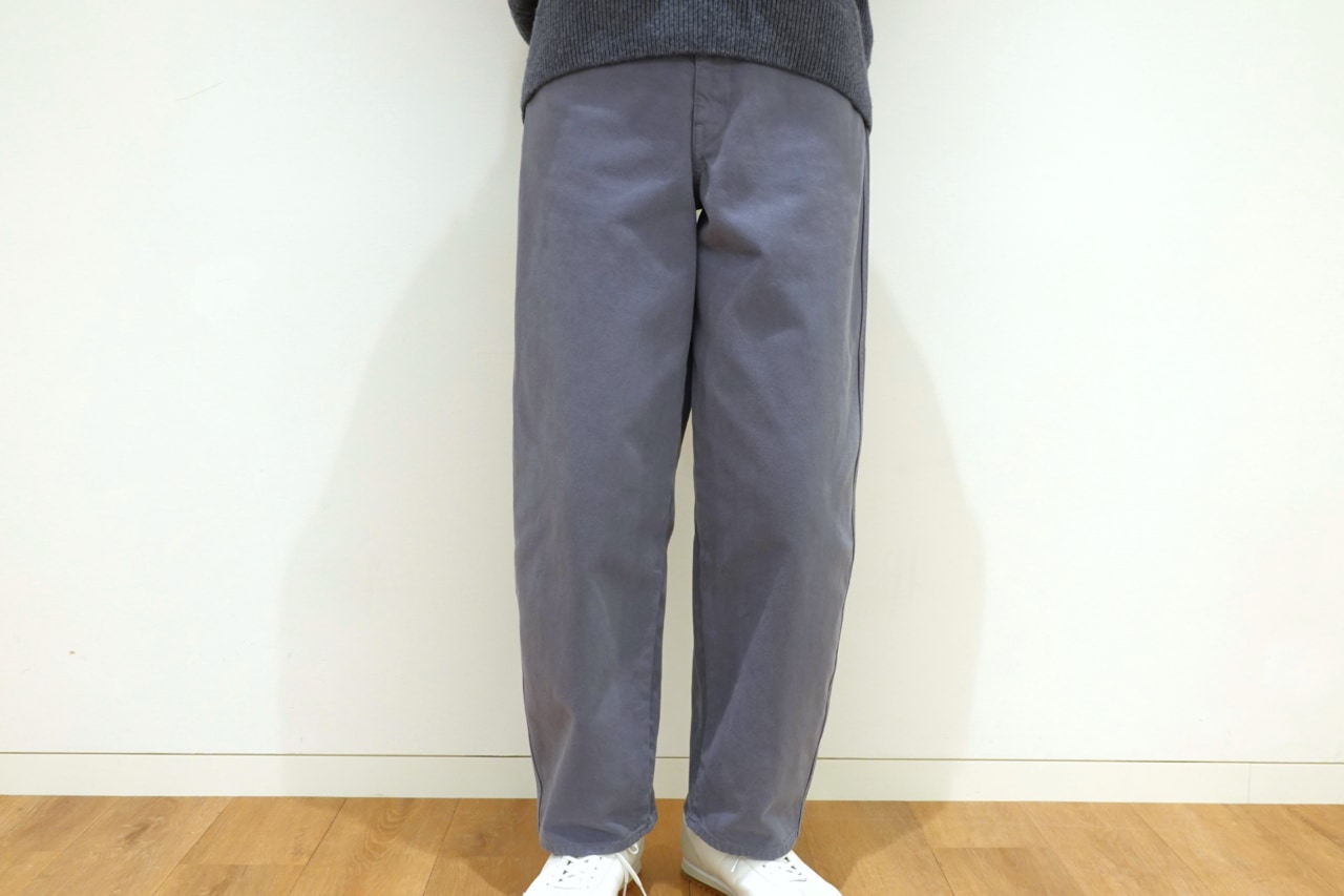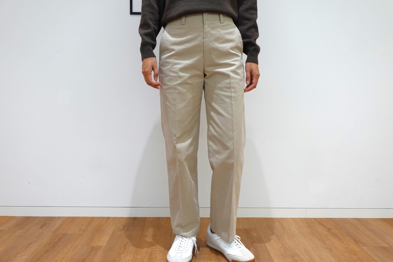 パンツはストレートシルエットの「コットンチノパンツ」をチョイス。ヒップまわりのフィット感やセンタープレスによって脚長効果も期待できそう。
