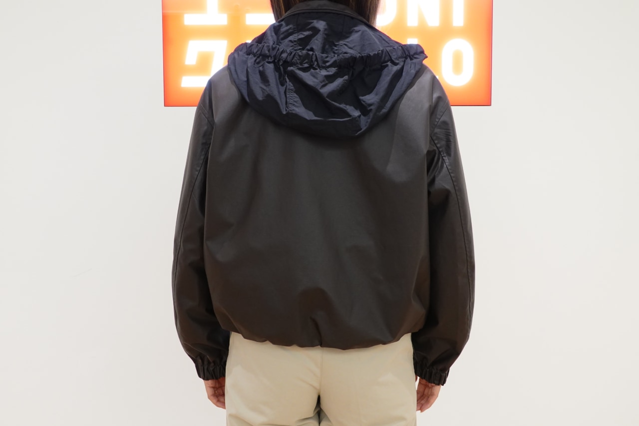 スタンドカラーの内側にはフードが隠れており、着用シーンによって違うルックを楽しめそう!バイカラーなのでアクセントにもなりますよ。
