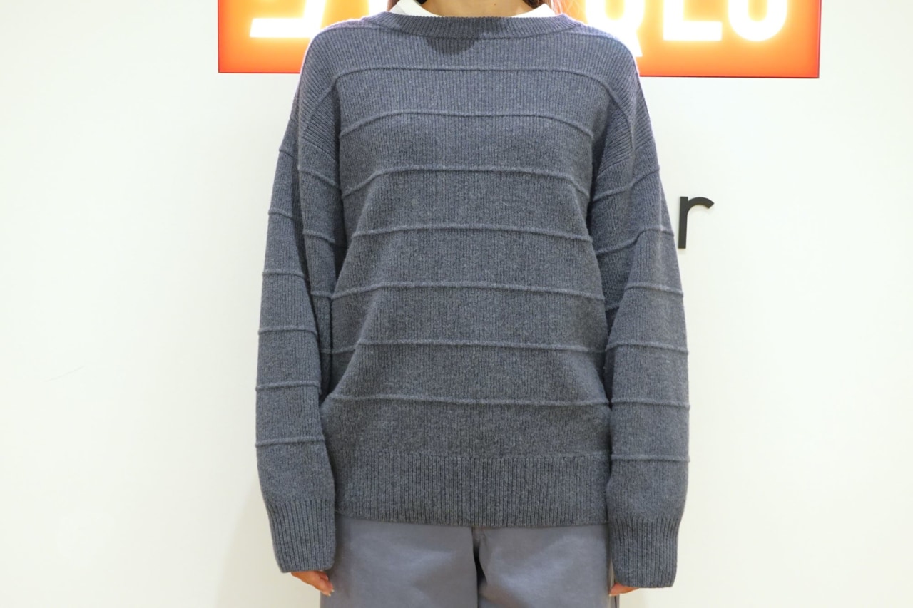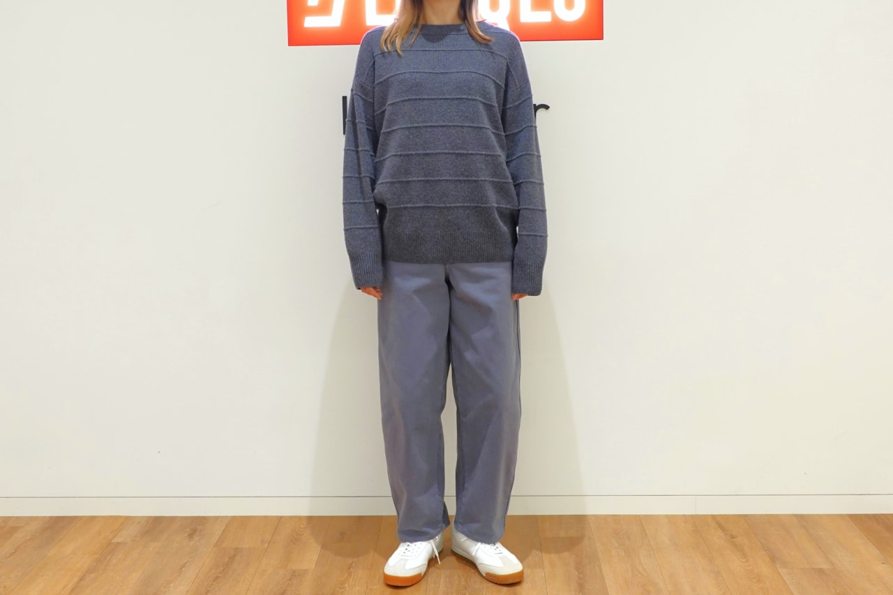 「ラムクルーネックセーター」(グレー 4,990円 ※一部店舗商品)、「スーピマコットンT/長袖」(オフホワイト 1,990円 ※一部店舗商品)、「カーブパンツ」(ブルー 4,990円 ※一部店舗商品)
