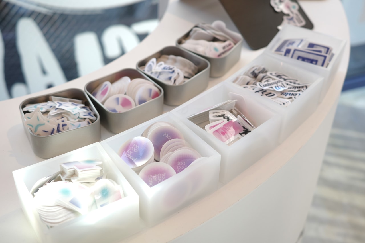 今回のPOP UPでは『too cool for school』のSNSフォロー画面を提示するとレシート風フォトが撮れるフォトブースを無料で利用できる他、設置されているシールで自由にコスメのデコレーションを楽しめるサービスも! 一人10枚までシールを使えるので、どんなデザインにするか個性がよく表れそうです。