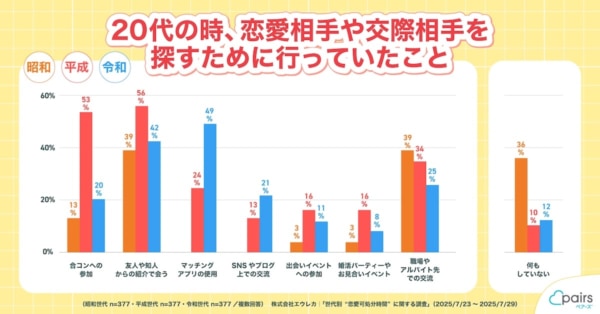 また、相手を探すための行動を「何もしていない」という回答率では、昭和世代が36.8%、平成世代が10.4%、令和世代が12.2%で、昭和世代が他世代に対して3倍強の回答結果でした。