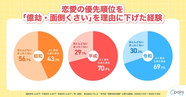 実際、これを裏付けるように「恋愛の優先順位を、億劫・面倒くさいという理由で下げた経験」について尋ねたところ、平成・令和世代は「経験がある」と回答した人が約70%であるのに対して、昭和世代は43.3%と半数以下にとどまります。