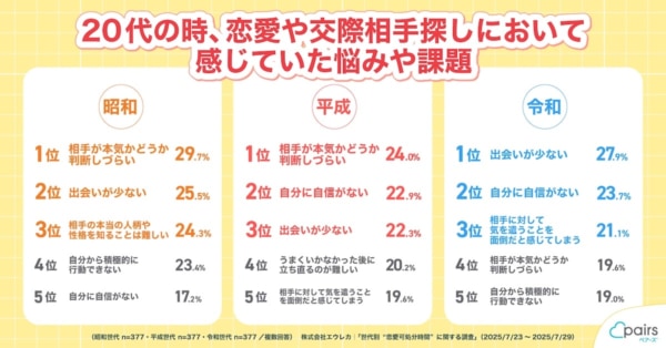 代わって令和世代のトップに立った回答は「出会いが少ない」(27.9%)となり、昭和・平成世代の“恋愛・交際相手の候補がいる前提”の悩みに対して、令和世代はそもそも相手に巡り会えていない実情が反映されています。