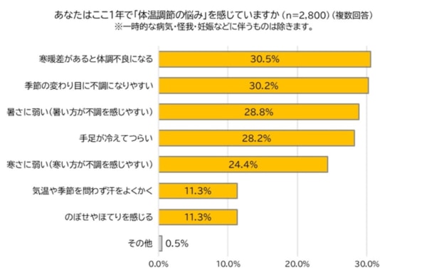 また、具体的な症状についてみると、約3割の人が「寒暖差があると不調になる」(30.5%)や「季節の変わり目に不調になりやすい」(30.2%)といった不調を抱えていることが分かりました。