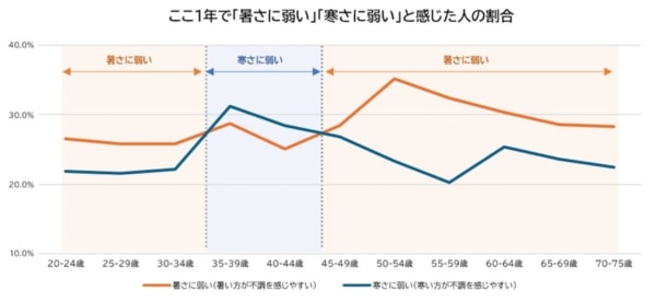 その後、40代後半になると「暑さに弱い」が再度逆転することから、暑さ・寒さの転換点は35歳・45歳にあることが分かりました。