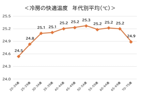 冷房を使う際に、快適に感じる温度について年代別に比較したところ、20代は低めの温度を好み、年代が上がるにつれて徐々に高くなり、50代前半で25.3℃と最も高い数値を示しました。