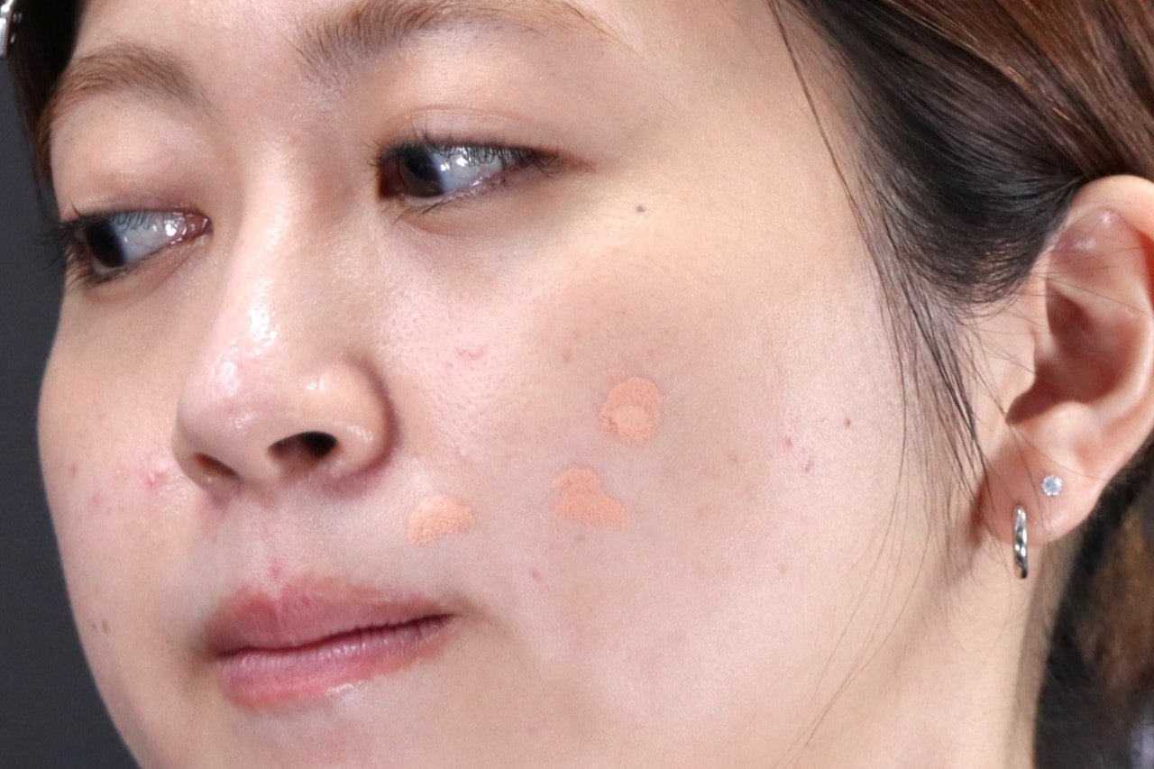 最後に、シミ、そばかすのカバー方法についても解説。広範囲に点状に広がるシミやそばかすのカバーにも、やはりオレンジが効果的なのだそうです。カバーしたい部分にはオレンジ、ハイライトを入れたい部分にはライトベージュをのせて、これまでの手法と同じようにクッションファンデーションを含ませたスポンジでなじませます。