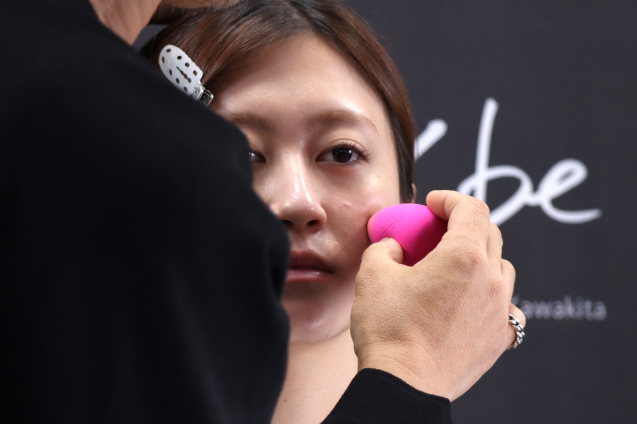 「&be」のベースメイクメソッドを象徴するアイテムのリニューアルに際し、&beはメディア向けにメイクセミナーを開催。河北氏が自ら「&be テンシーラーUVプラス」の使い方を披露しました。