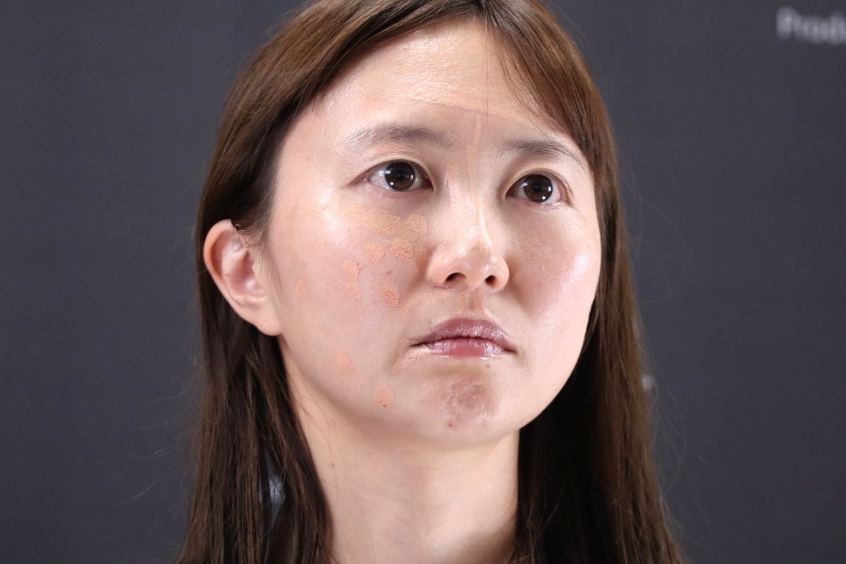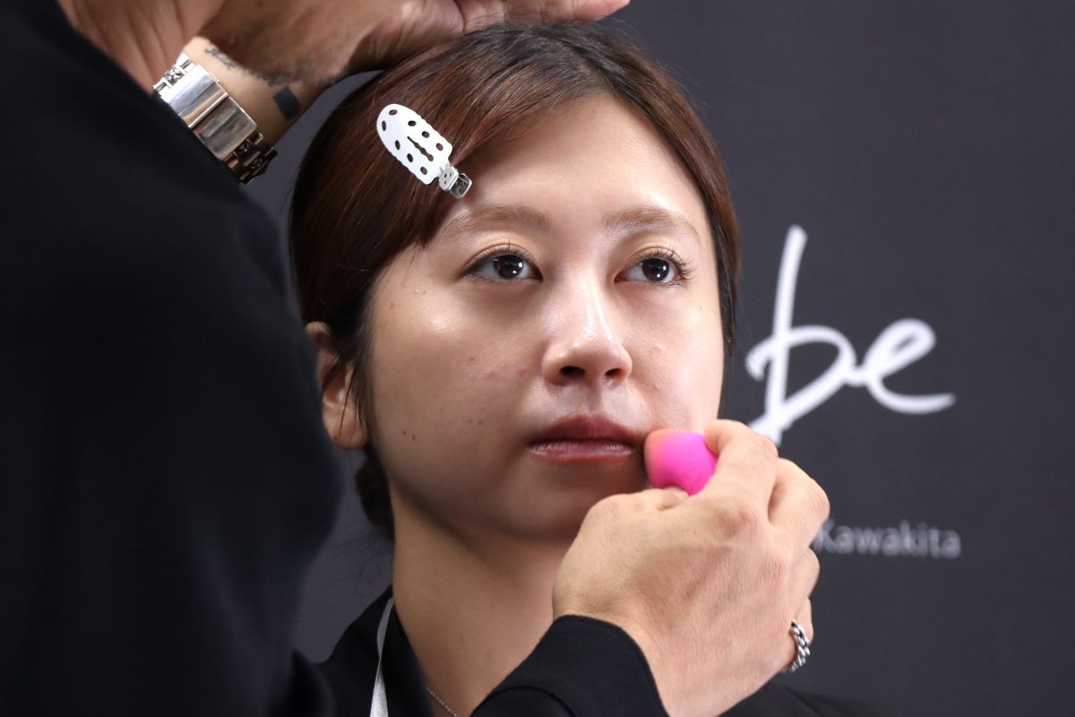 イベントでは河北氏が実際にメイクモデルたちの肌悩みをカバーしながら、使い方を解説しました。「&be テンシーラーUVプラス」は基本的にオレンジ色、クッションファンデーション、必要に応じてベージュカラーの順で使うのが良いのだとか。