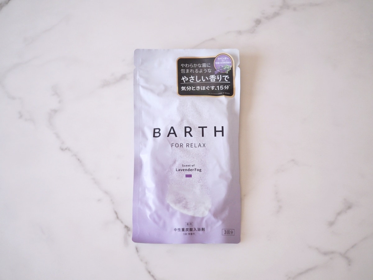 入浴中のお供は、温浴効果により血行を促進するBARTHの「薬用BARTH中性重炭酸入浴剤RELAX LavenderFog」。ラベンダーのやさしい香りに包まれながら五感に意識を傾けて、体の芯まで温まったと感じたら浴室を後にします。