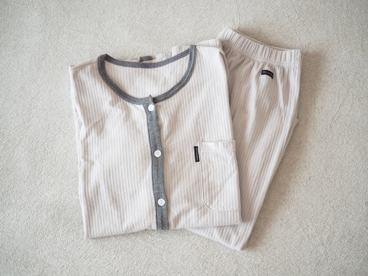 ボディケアを終えたら、コットン混でやわらかな肌触りが心地良いVENEXの「リカバリーパジャマ ニットサッカー レディース」を着用します。一度着ただけでも翌日のすっきり具合を実感できたので、リカバリーウェアは今では欠かせない存在です。
