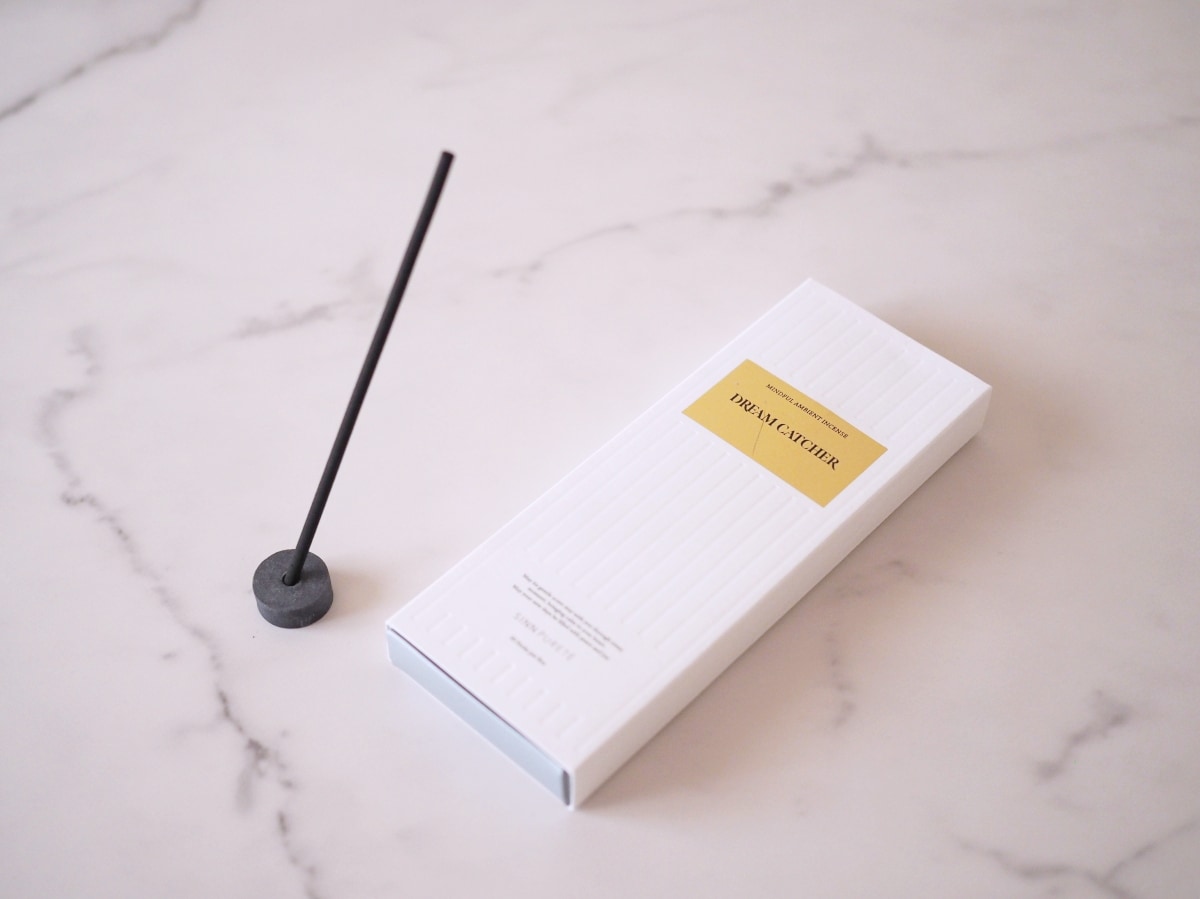 寝室では電球色の間接照明と好みの香りでリラックス。最近ハマっている香りは、シンピュルテと悟空のきもちが共同開発したお香の「マインドフル アンビエントインセンス DREAM CATCHER(夢守り)」です。