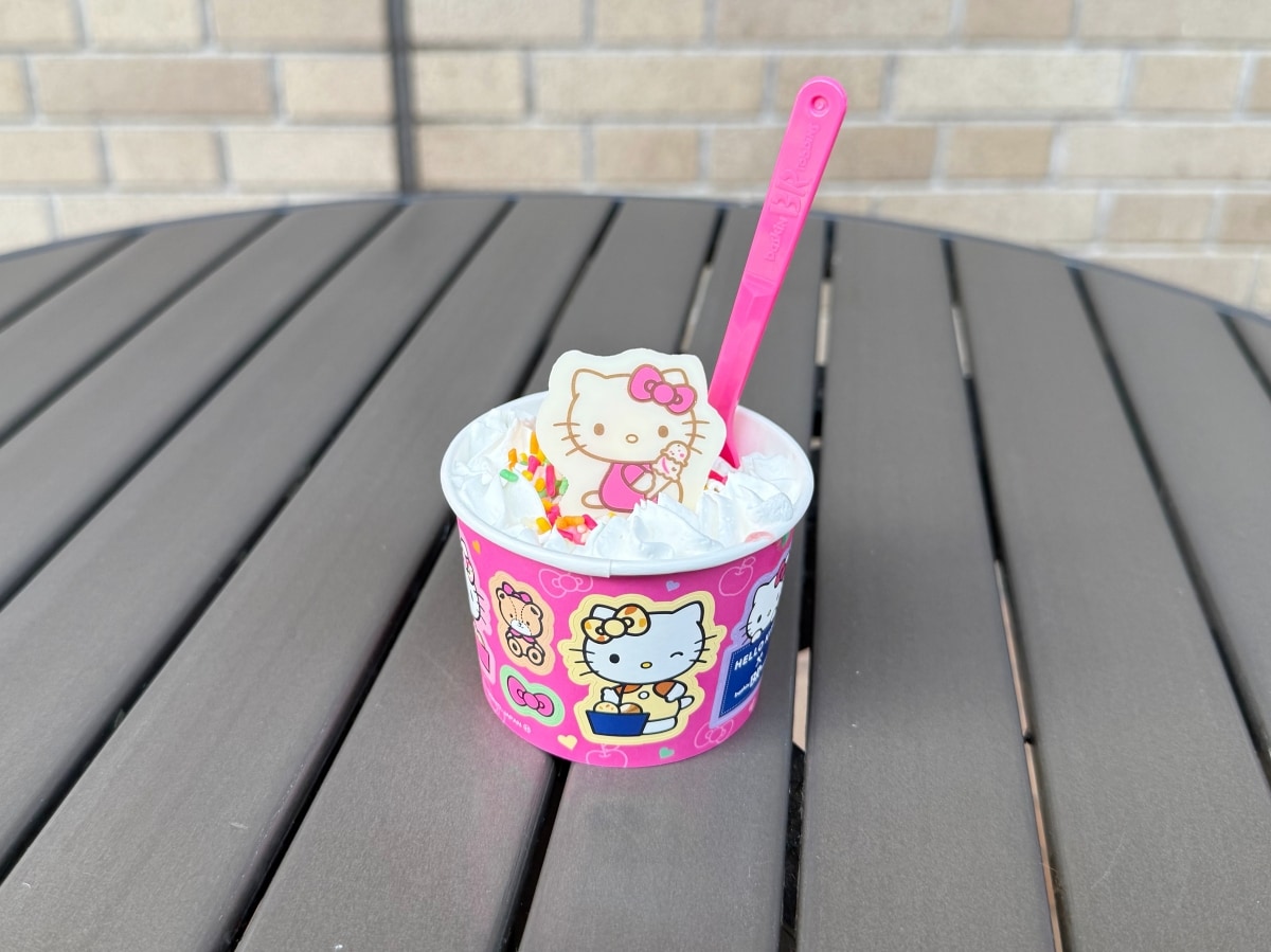 アイスクリームをたっぷり楽しめるフレッシュパック ミニも、ハローキティが大きくデザインされた限定カップで登場しました。好きなアイスクリームを2つまで選べると定員さんから聞いて、贅沢に2種類のせてみました。