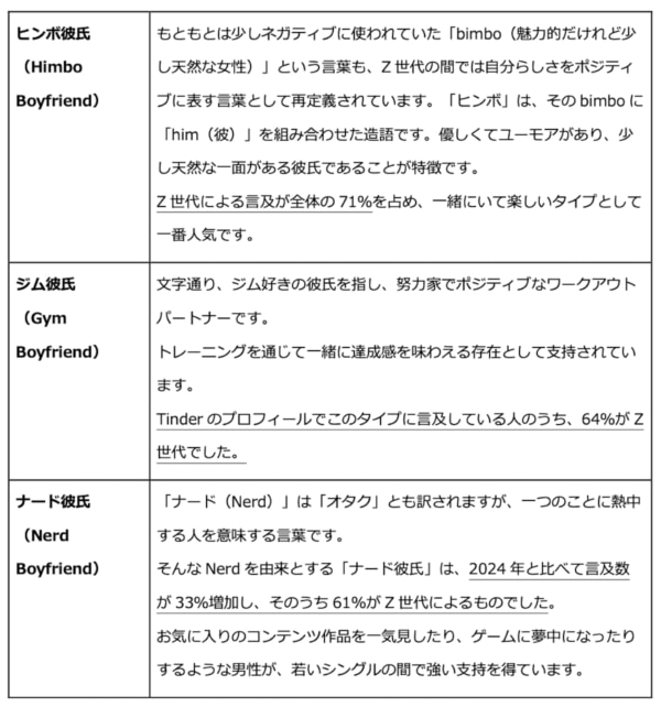 今年、Tinderのプロフィール上[1] で特にZ世代の注目を集めているのは、「ヒンボ彼氏(Himbo Boyfriend)」「ジム彼氏(Gym Boyfriend)」「ナード彼氏(Nerd Boyfriend)」の3つのタイプの彼氏です。若いシングルたちを中心に、これらの彼氏のタイプを理想として挙げる人が増えています。