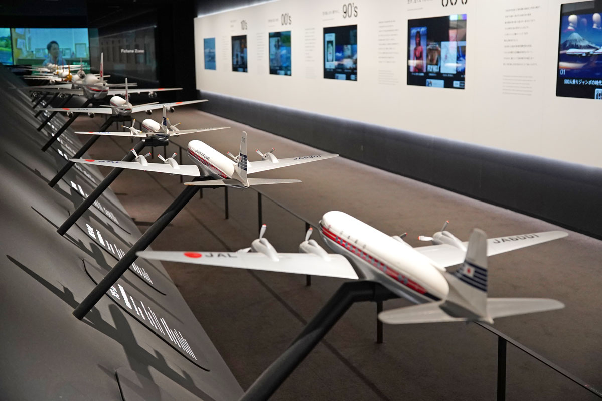 1950年代から2010年代までのJALの航空文化史を紹介するデジタル年表をのほか、歴代航空機12機のモデルプレーンの展示も。すべて同一の縮尺モデルを展示しているので、「最初はこんなに小さかったんだ!」と、航空機のサイズの変遷も感じることができるんです。