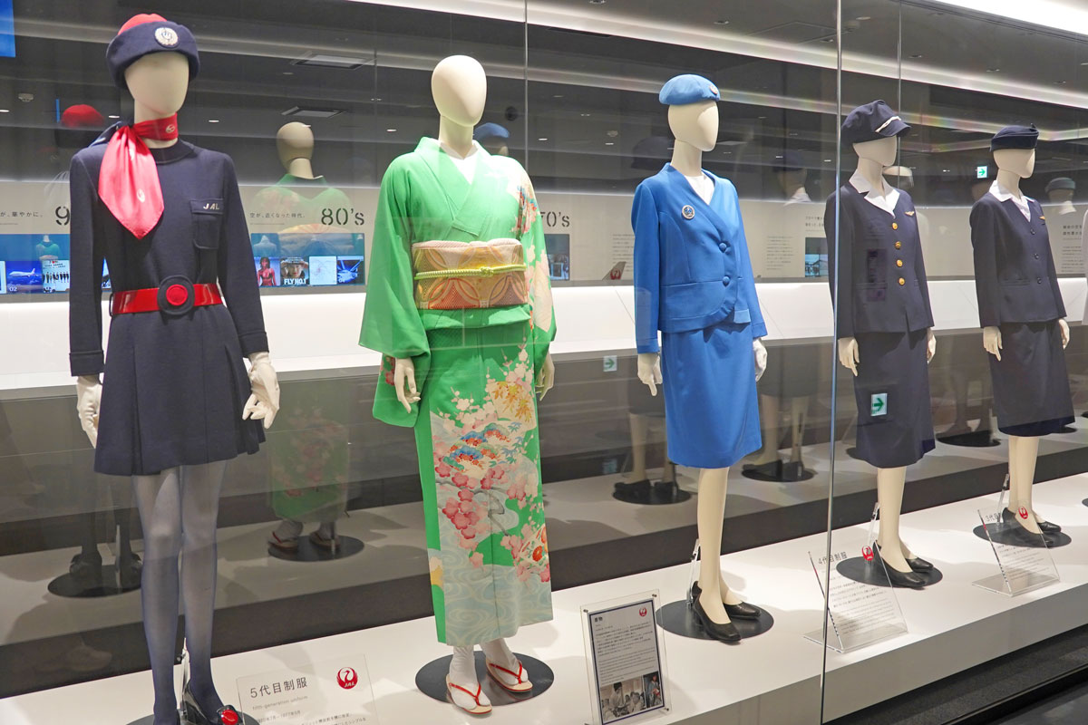 JALの歴代制服(実物)が一堂に展示されているコーナーも。なんと、JALでは1954年から1990年の37年にわたって着物でサービスを行っていたんだとか!