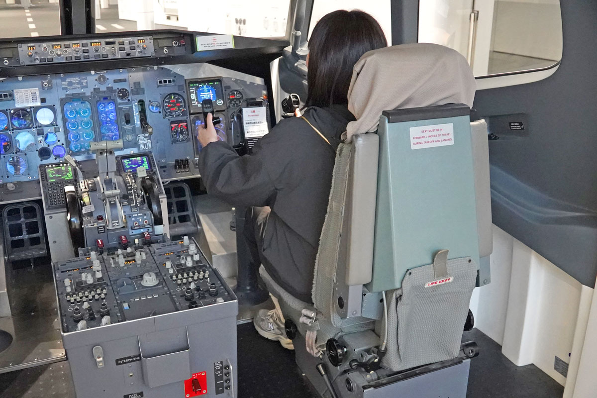 また、奥に見えている飛行機の部分では、コックピットや客室の雰囲気を楽しめる模型などを展示しています。実際に座って触ることもできるので、誰もいない時にこそっと座ってみました……!