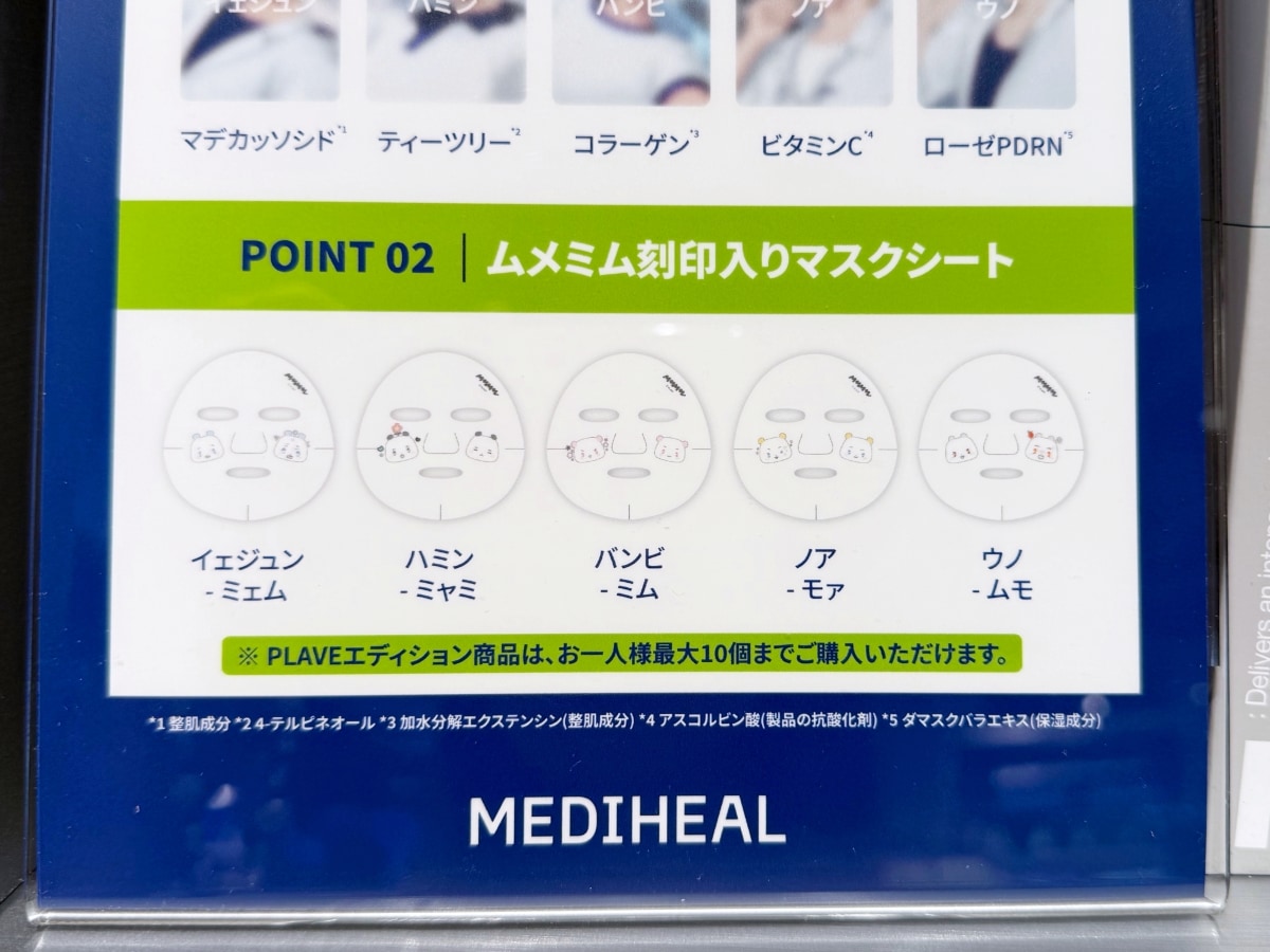その隣に並んでいたのは、PLAVEとコラボレーションしたスペシャルグッズの“PLAVEエディション”。特に注目を集めそうなのが、メンバーカラーと成分をマッチングさせた限定パッケージの「エッセンシャルマスク」です。