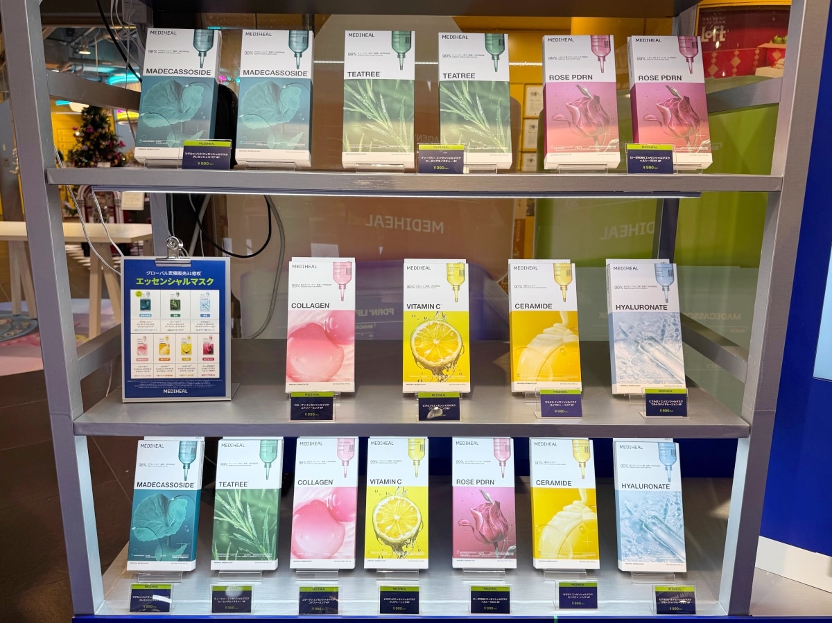 PLAVEエディションの他にも、メディヒールを代表するシートマスクや、日本限定アイテムを購入できるのがこのポップアップの魅力の一つ。メディヒールのベストセラー「エッセンシャルマスク」シリーズは、肌タイプや悩みに合わせた全7種が並んでいます。