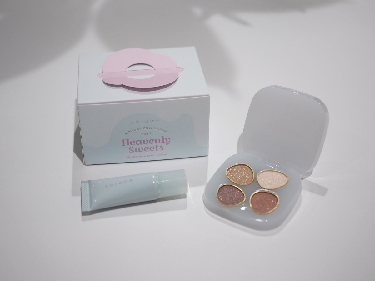 よしかわ:to/oneは子どもの頃に憧れたスイーツの世界を表現したコレクションになっていて、コフレがケーキボックスに入っているのが乙女心をくすぐります。「トーン ヘブンリー スイーツ ボックス」の「Like a Fairytale&Salted Toffee」はヌードグロウの配色になっていて、センシュアルな目元が完成。こっくりとしたトフィーブラウンの「ペタル メルティング バーム EX02」は、アイシャドウとセット使いはもちろん、どんなシーンでも活躍します。