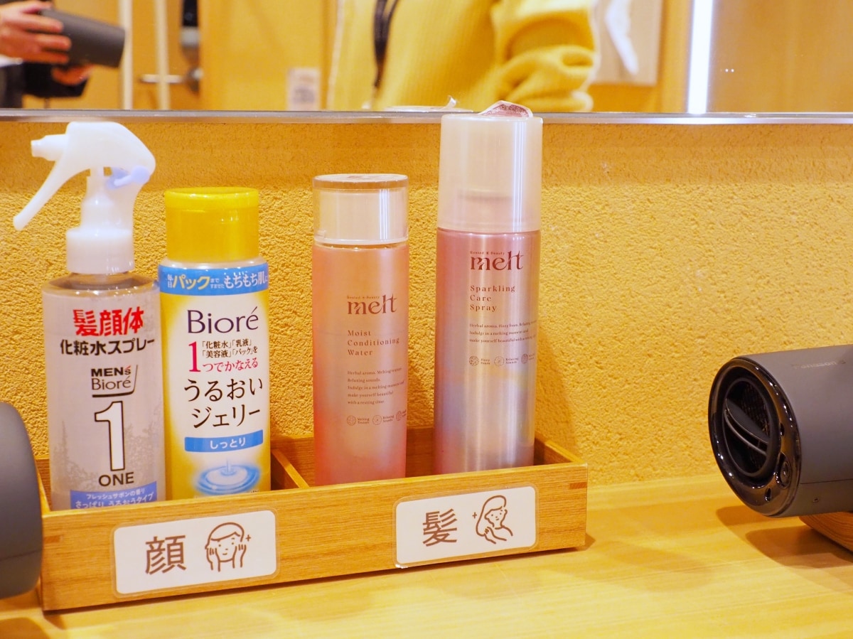 小杉湯原宿の脱衣所を覗いてみると、早速meltのアウトバスアイテムを発見。入浴後の髪と地肌を健やかに保ち、手で押さえたときのパチパチはじける清涼感と香りでリフレッシュ気分を体験できる「メルト スパークリングケアスプレー」と、ドライヤー速乾をかなえる髪用化粧水の「メルト モイストコンディショニングウォーター」がドレッサーに設置されていました。