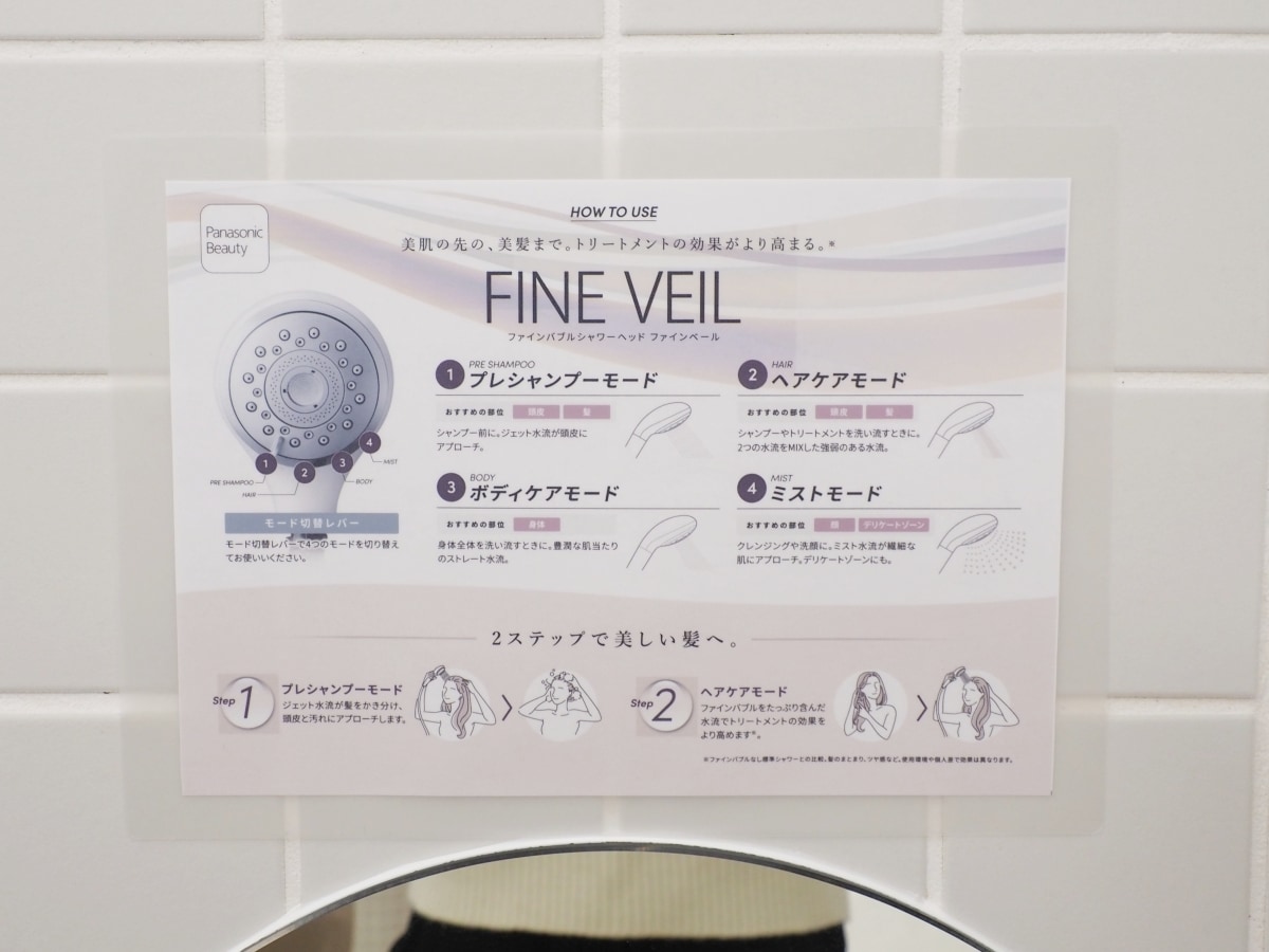 鏡の横には「ファインバブルシャワーヘッド ファインベール」が設置され、その隣には各モードの説明やヘアケアに特化した2モードについても分かりやすく記載されていました。