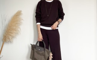 トップスは同じくユニクロのスウェットクロップドシャツ。丈が短めなのでバランスよくまとまりやすく、上下スウェットで合わせても、部屋着感がなく着られます。ヒールとかっちりバッグを合わせれば少しカジュアルな通勤スタイルに。