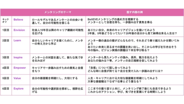 女性管理職育成に特化したメンタリングの知見を持つMentor Forの監修のもと、「BeliEVE Mentoring Program」を活用し、約半年間にわたるメンタリングを実施しました。