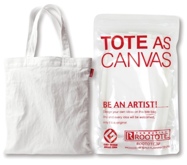 多くの人に、絵を描く楽しさや表現する楽しさ、また、それが鑑賞される楽しさを感じてもらいたい。そしてそのトートバッグを持った人々が行き交う街はギャラリーのようになって楽しいのでは、というコンセプトから2003年10月に生まれたROOTOTE(ルートート)の真っ白なトートバッグです。