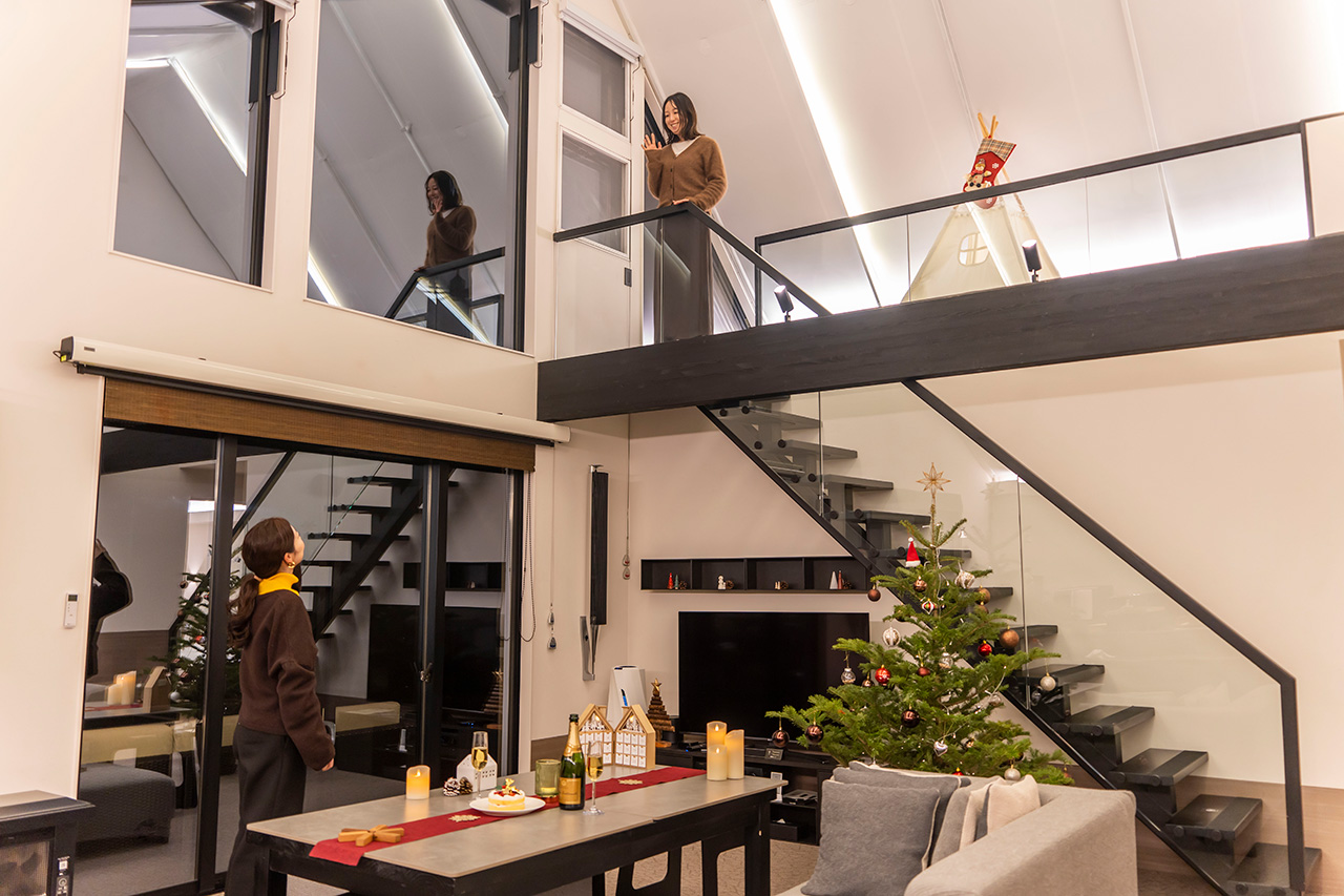 リビングにはツリーやオーナメントが飾られ、期間限定でクリスマスムード一色に。大きなクリスマスツリーは、群馬県嬬恋の森から届いた天然もみの木を用いています。