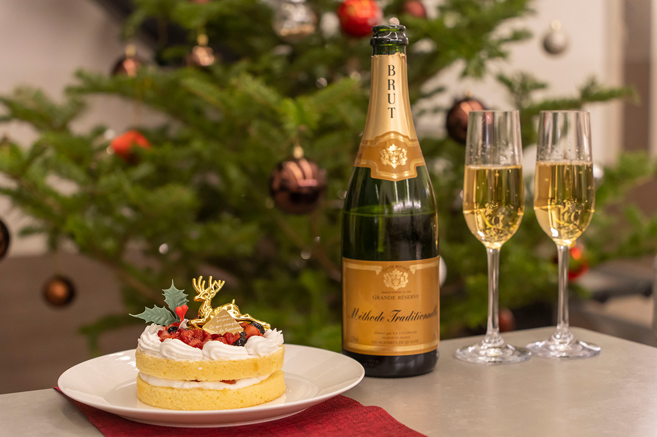 特典のクリスマスケーキは、トナカイやヒイラギのデコレーションがかわいいイチゴのケーキ。ケーキがあるだけで、空間も華やかになりました! もし2つの特典を選びたいときは追加注文も可能。例えば特典でスパークリングワインを選び、プラス3,500円でケーキを注文できます。
