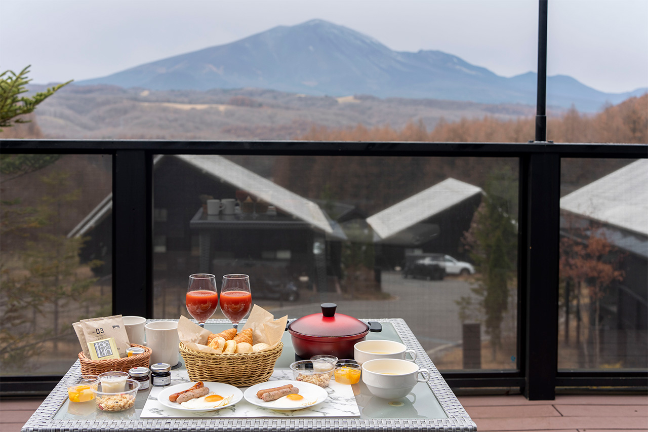 朝食は、テラスで浅間山を眺めながら。前日にスタッフが食材を持ってきてくれるので、自分の好きな時間に作って食べられます。チェックアウトは12:00で、のんびり朝食を楽しめるのもうれしいポイントです。