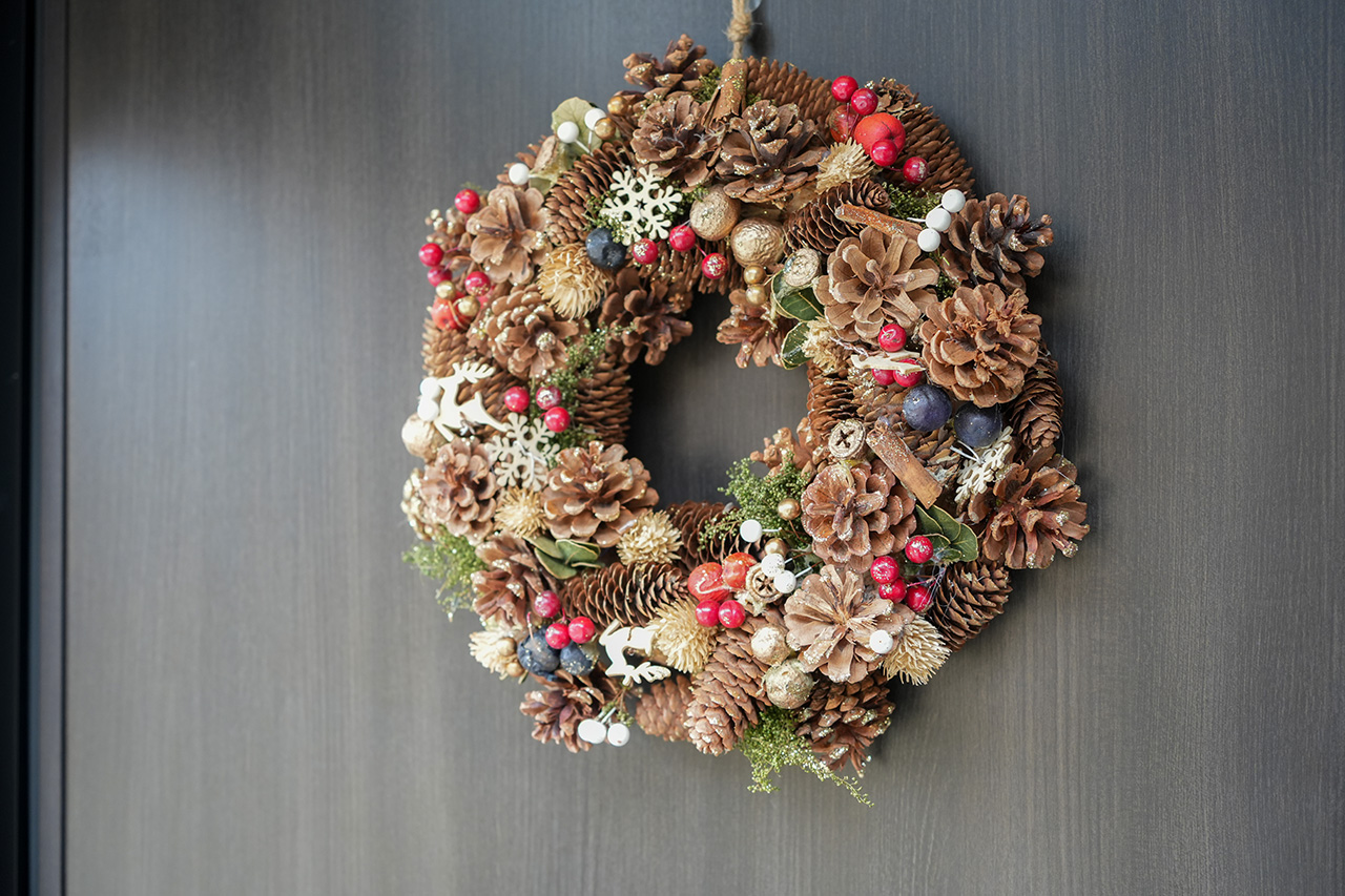 あさま空山望がユニークなポイントは、「フロントがない」こと。到着したら、事前にメールで連絡を受けたヴィラに直接向かい、暗証番号を入力して入室します。チェックインのために並ぶ必要はなく、待ち時間0分! 扉にはクリスマスリースが飾られ、ワクワクしながら入室しました。